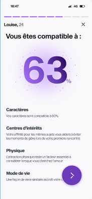 Ne cherchez pas à plaire à tout le monde, mais à la bonne personne. Notre algorithme ne se contente pas des critères basiques. Il vous présente des célibataires dont la compatibilité est vérifiée sur tous les plans. Chaque profil suggéré est une promesse d'affinités réelles. Vous avez l'assurance de rencontrer quelqu'un avec qui le potentiel d'une belle histoire est maximal.